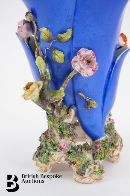 A blue glaze fluted vase, in the Coalport Coalbrookdale manner, encrusted with flowers and bocage heightened with gilt, approx 19 cms h, marked CD.