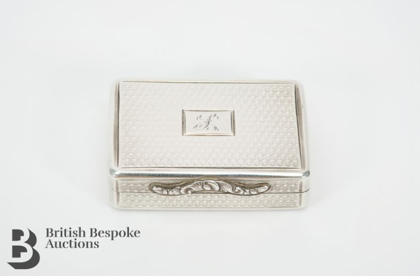 Victorian silver vinaigrette, mm Nathaniel Mills dated 1839, mm Nathaniel Mills, approx 28 gms. The box having a gilded interior with pierced grille, engine-turned decoration to both sides, monogram L, approx 40 x 30 mm.
