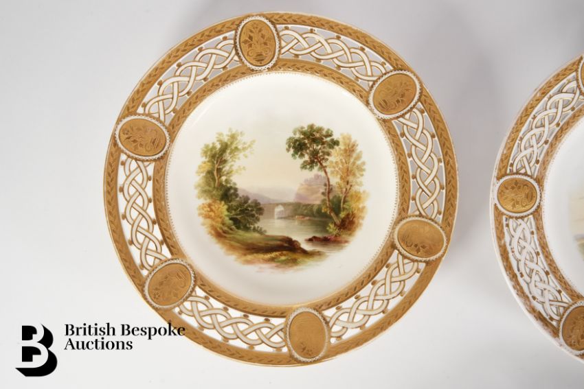 Three 19th century Minton plates, each central reserve finely painted with English scenes, enclosed by pierced plaited rim heightened with gilt, approx 23 cms diameter together with two Continental cabinet plates, the central reserve painted with wild flowers with pierced decorative rim approx 21 cms diameter.