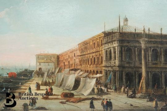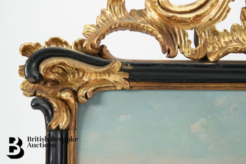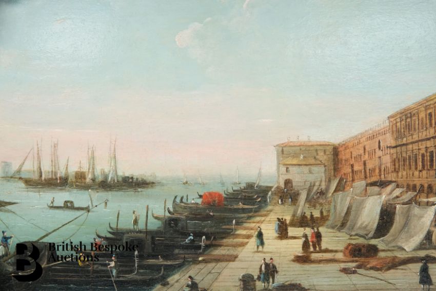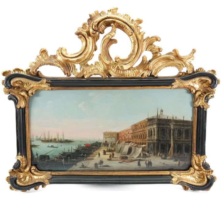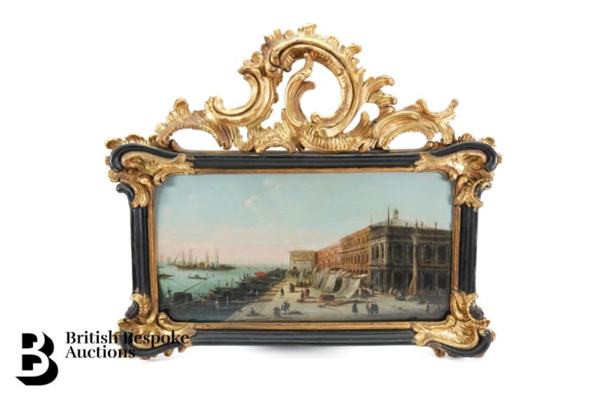 Follower of Giovanni Antonio Canal il Canaletto, 18th century oil on panel, View of the Grand Canal, Venice, approx 20 x 30 cms, presented in an elaborate gilt wood frame, originally purchased from Baumkotter Gallery Kensington Church Street London.