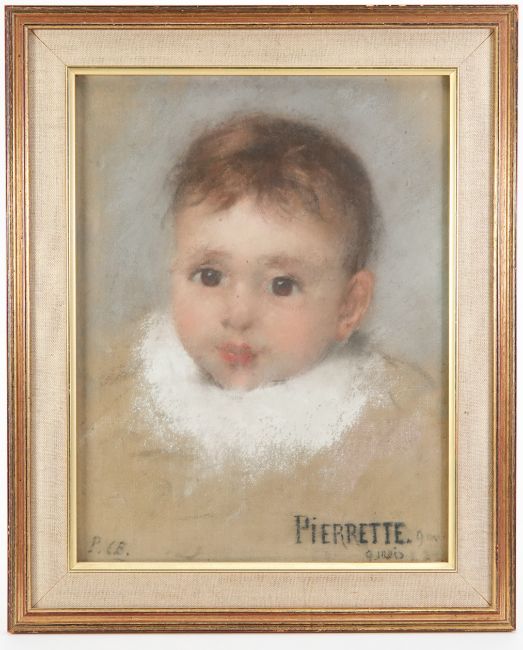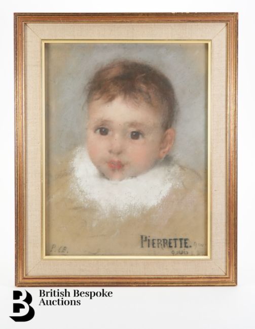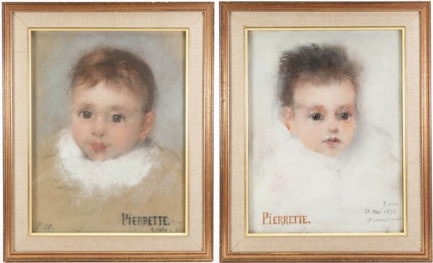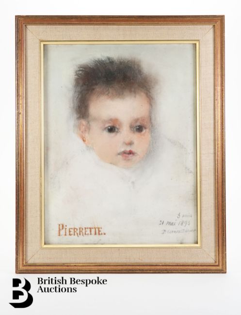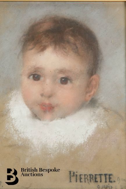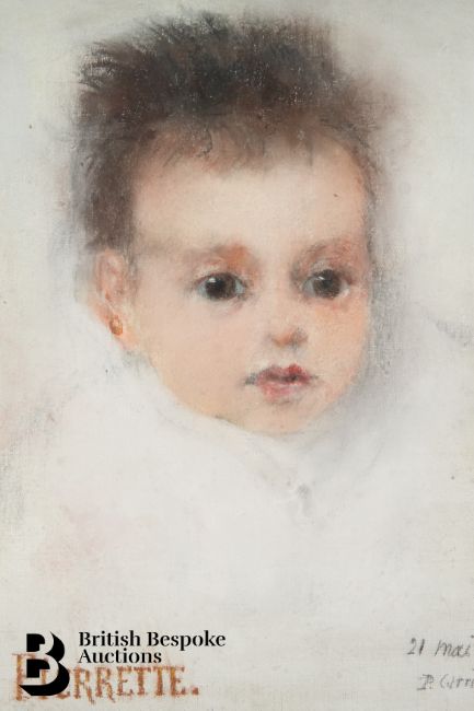 Pierre Carrier-Belleuse (1851-1932) pastel, entitled 'Pierrette' at 3 and 9 months, monogrammed P.C.B, dated 1893, approx 24w x 32 h cms, framed and glazed.