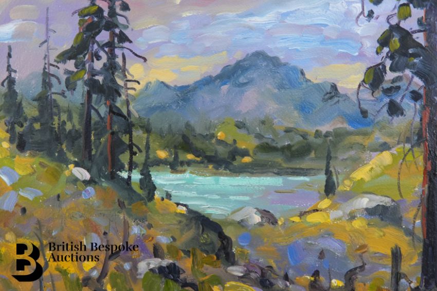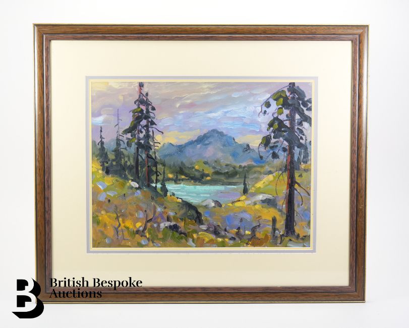 20th century oil on board, entitled Mountain Dusk, unsigned, pen note to verso title and artist R Chaluh (?), approx 40 x 30 cms, framed and glazed.