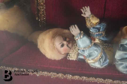 19th century French tableau mecanique automaton, Chinese figure lying on his back kicking colourful balls into the air. He has a bisque head with painted features and a topknot, wearing a pale blue and white satin costume heightened with foil. He has metal hands and a papier-mache body articulated at the elbows and knees. The figure is surrounded by velvet draped theatrical stage heightened with foil and off stage mirrors. The back of the case opens to reveal a movement with a gear train driving pulleys, presented in a gilt wood frame and case, complete with key engraved nr 16 and a simple stop and start button to the side of the case. When wound this does work, the head turns, the arms move from the elbow, the knees move and kick the balls into into whilst a melody plays. Video: https://youtube.com/shorts/4YblAsXRe2I?si=JaYDz3r_uNIpNYn9Condition ReportThis automaton may have been subject to restoration including possibly the curtains, buttons and foil but this may also be that these elements are just in good condition.