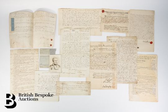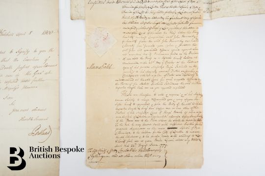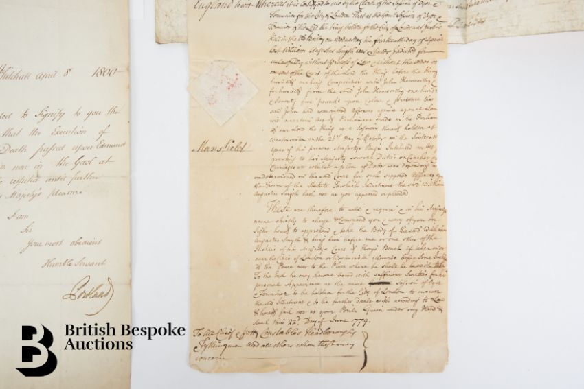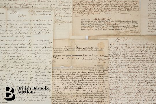 This lot comprises 15 letters or documents dated 1724 to 1800 with interesting good content: 1724 Indenture 1730 account relating to expenses incurred in connection with the trial of Archibald Campbell. 1732 Summons to appear in Bristol Court addressed to Samuel Miller. 1737 Court or other Official Order issued at Edinburgh on 15th January and signed by Thomas Baillie 2 days later. 1740 Letter of Attorney to receive Conviction Money issued and signed by Thomas James Selby and directed to Howard Middleton (small area of the document missing top           left). 1749 Writ of execution for recovery of money (stained). 1754-57 Spectacular copy Causes (Contemporary copy of original) relating to the committal of William Macartney to prison. 1762 Warrant for housebreaking and stealing (some poor repairs) to apprehend Jonathan Makin. 1779 Arrest warrant issued and signed by Sir James Mansfield ( damaged/reduced along the right hand side). 1786 vellum document in manuscript relating to the victualling of the Navy and (?) taken by William Greenwood. 1786 promissory note signed by Major J.G Semple at Yarmouth with "Treasury Coffee House" at the bottom left, also included are three cuttings relating to Major Semple's             "Practices of Imposition". 1789 letter relating to an Army deserter. 1800 stay of execution signed by the Duke of Portland as Home Secretary.  -