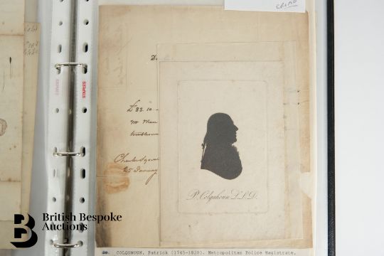 A black ring binder containing letters or documents from 1703 to 1838, with much interesting content relating mainly to crime. This lot comprises thirty one letters or documents dated from 1703 to 1838 (plus a group of papers from about the 1790's relating to debtors held at Marshalsea Prison). Other items of interest in this lot include 1790's Order for Payment of £1000 to Thomas Lord Bishop of Chichester signed by various persons including John Aislabie who as Chancellor of the Exchequer was a strong supporter of the arrangement whereby the South Sea Company covered the national debt in exchange for government bonds (The South Sea Company collapsed just three months after this Order was issued). There is also a list of Grand Jury members dated 1781 and another jury list of 1790; letters relating to highway robbery and debts; a statement of 1787 concerning a deserter; a pardon of a military officer made on the 26th October 1712 headed Anne R and signed Bolingbroke (Viscount St John); a document of 1703 regarding a scandalous and blasphemous libel by Thomas Emlin; an arrest warrant of 1784; an entire letter with the Bishop mark dated 1749; a 1721 Statement by Samuel Simpson relating to smuggling and a letter of 1782 similarly on smuggling; a 1798 letter from a prisoner in Newgate making a final plea for clemency a few hours before his execution for high treason. Much else of interest.  -