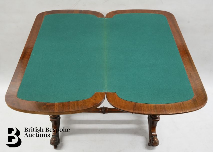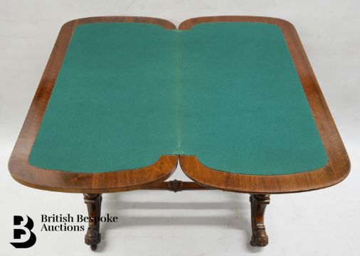 A Victorian burr walnut card table, swivel top with green baize interior, over carved supports and stretcher, with decorative inlay, approx 90 x 90 cms when opened and closed approx 89 x 46 cms.
