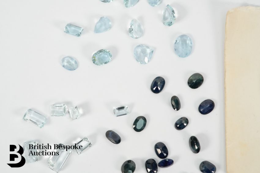 Quantity of loose gemstones including eight white aquamarine, eleven blue aquamarine, fourteen blue and green sapphires, three sun stones including a large oval 22 x 16mm, small oval 20 x 15mm and circular approx 16mm diameter, black fire opal doublet approx 18 x 13mm; green fire black opal doublet approx 28 x 22mm together with another black fire opal doublet 18 x 13mm all three opals from Lightning Ridge, New South Wales.