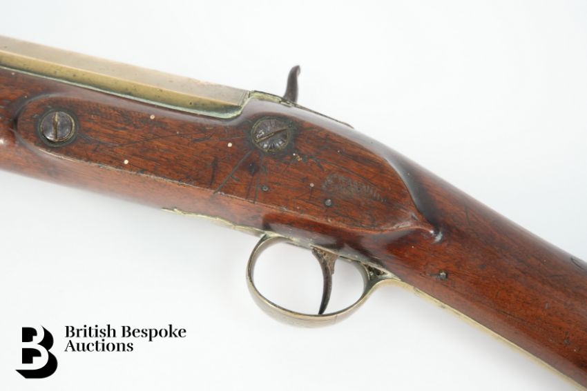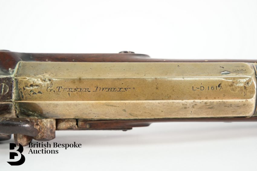 George Turner, Dublin, early 19th century blunderbuss, with brass barrel flared at the muzzle, iron trigger and lock plate with a brass trigger guard, breech signed in full and struck with an Irish registration mark beyond, plain brass mounts, missing ramrod, approx 77 cms in length.