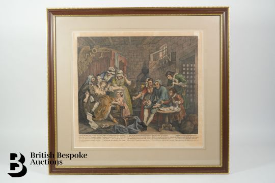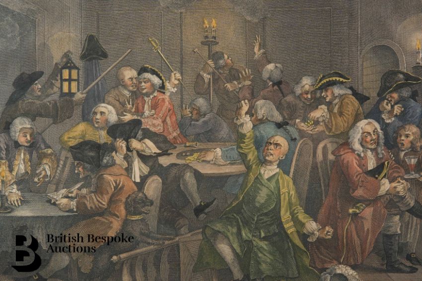 William Hogarth coloured prints from the The Rake's Progress Series, plate nr 4, 5, 6 and 7 of eight, lower right corner reads: Invented Painted & Engraved by William Hogarth, & Published June ye 25th 1735 According to Act of Parliament, sold at ye Golden Head in Leicester Fields, London. All four mounted, framed and glazed with museum conservation glass, approx. 41.5 x 36 cms. -