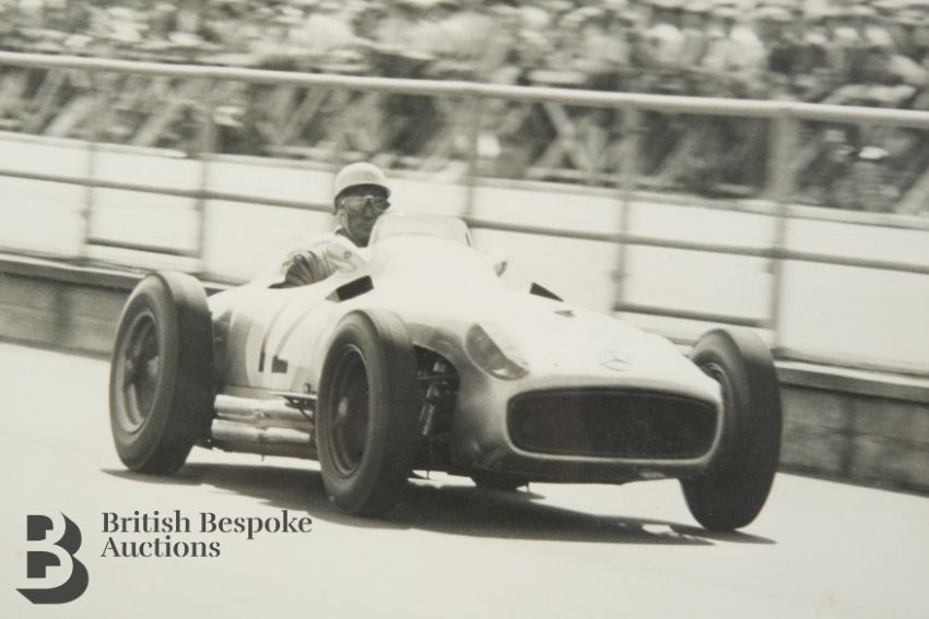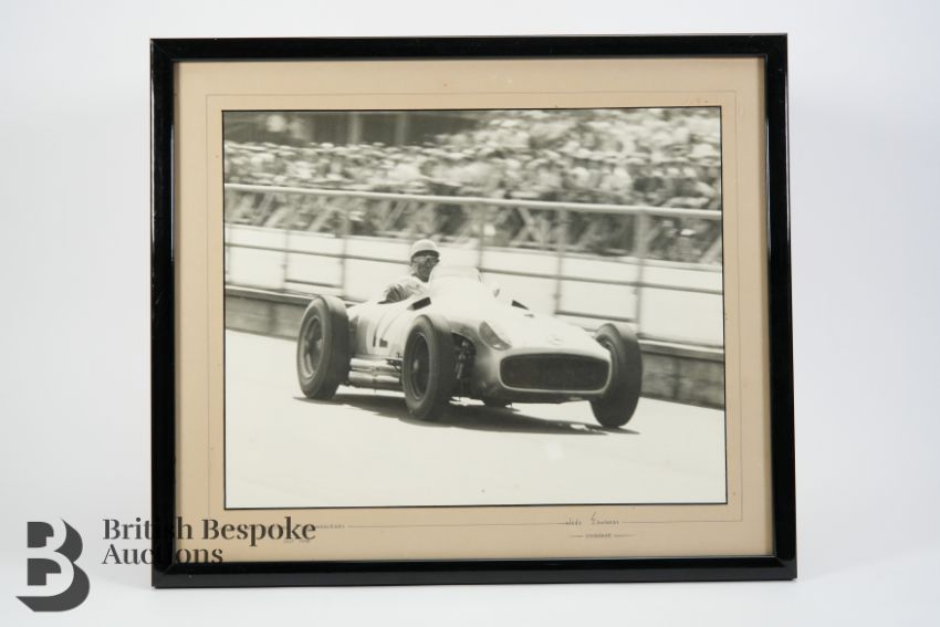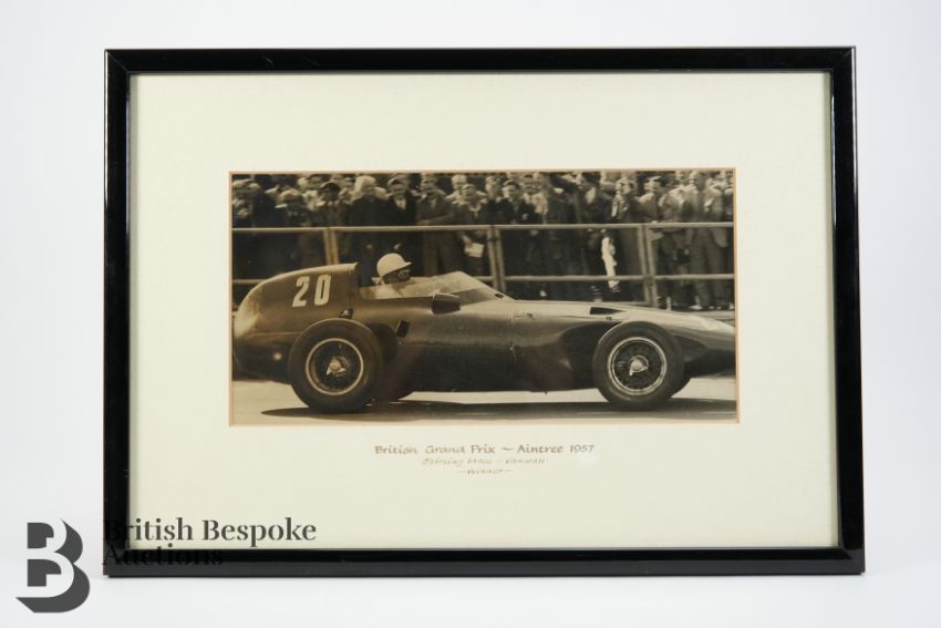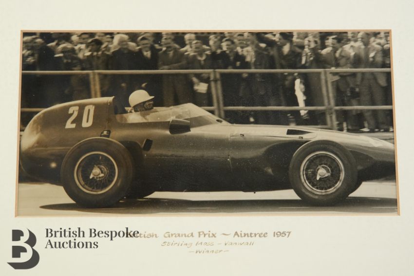 A black and white photograph of Stirling Moss, racing in a Vanwall VW5 and winning the British Grand Prix at Aintree 1957, approx 28w x 14 h cms together with another black and white photograph of Stirling Moss racing in a Mercedes July 1956 approx 30w x 24 cms, both framed and glazed.