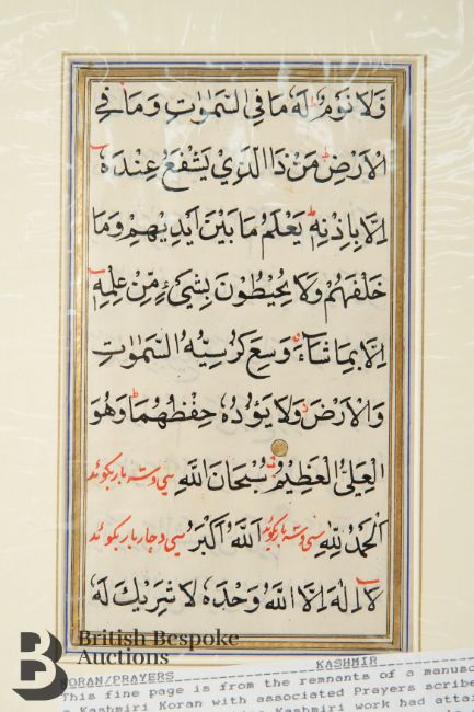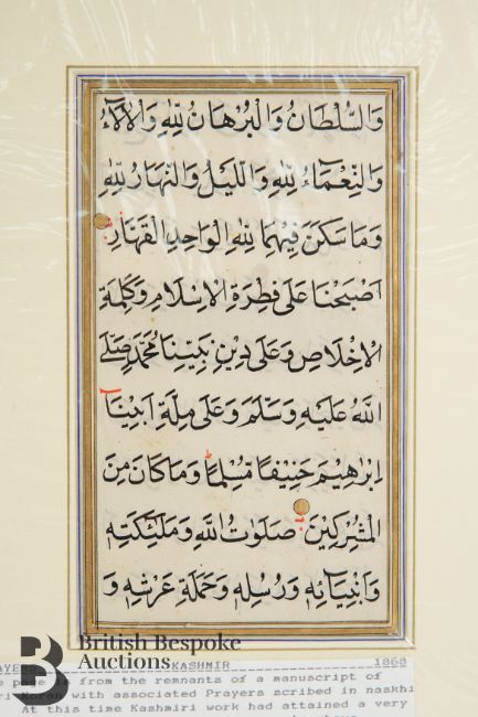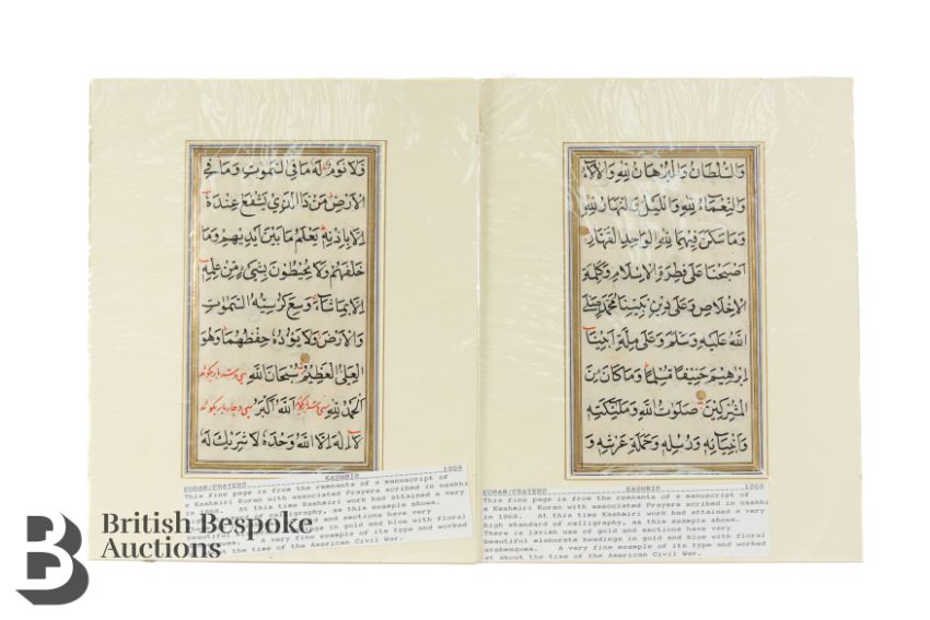 Two 19th century Kashmiri Koran pages, from a Koran dated circa 1868, written in Naskhi calligraphy, approx 10 x 17 cms, mounted.