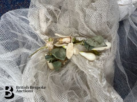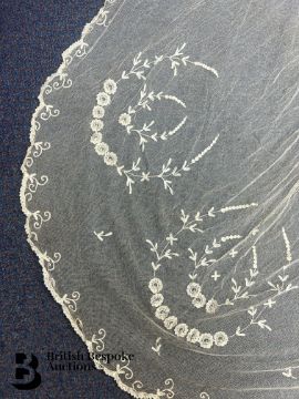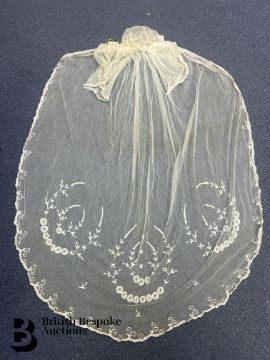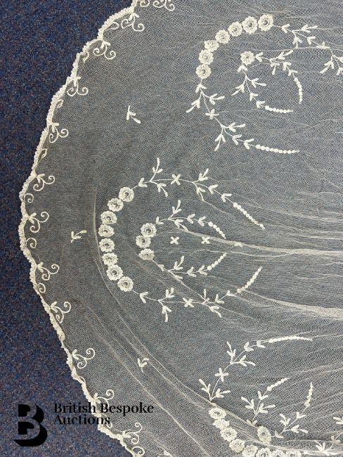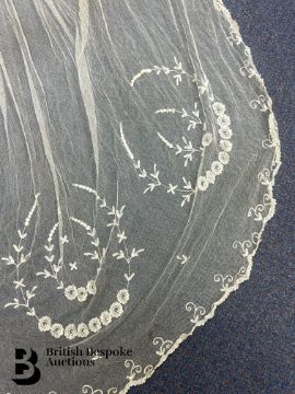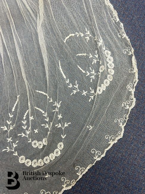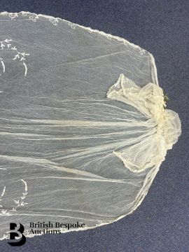 A delicate circa 1920's/30's cap veil, the borders embellished with fine embroidery, with floral detail over the one ear, approx 135 cms in length.