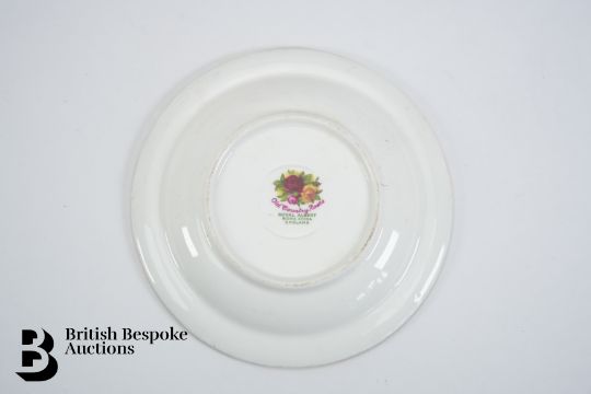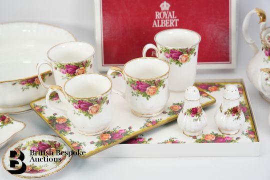 Royal Albert 'Old Country Roses' part dinner service and tea set comprising teapot (af), milk jug, two sugar bowls, seventeen 10.5" dinner plates, gravy boat and saucer, twelve mugs and saucers, two coffee mugs, two large tea cups, 8" fifteen plates, eleven 8" soup bowls, fourteen dessert bowls, oval meat dish, two square pin dishes, pen rest, circular trinket dish, large fruit bowl 10.5 and salt and pepper.