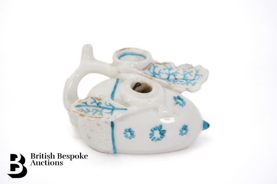 Charming 18th century soft paste porcelain ink pot, in the form of an acorn, picked out in turquoise enamel heightened with gilt, incised 631 approx 9 x 6.5 cms. (af)