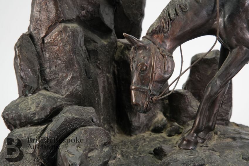 Steve Davies (b.1964 ) bronze figural group, entitled 'Quenching his Thirst', supported on a verde marble base, approx 53w x 36 h cms.