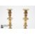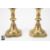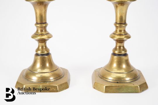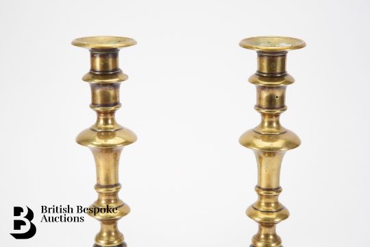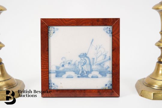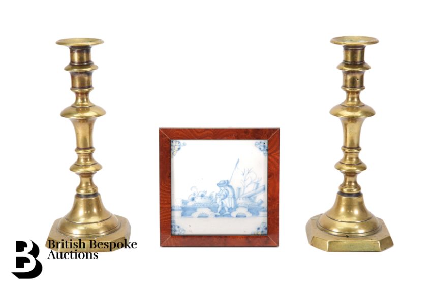 Pair of Dutch-style brass candlesticks, approx 26 cms h together with an 18th century blue and white Delft tile, depicting a piper playing to squirrels, approx 12 x 12 cms.