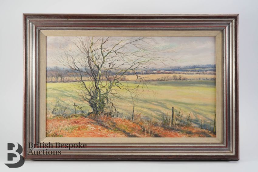 Mervyn Goode (20th century) oil on canvas entitled 'Shadows below Noar Hill', Hampshire approx 31 x 51 cms together with another oil on canvas by Noel Shepherdson entitled 'Under the Black Mountain nr 29' approx 49 x 39 cms, framed. (2)