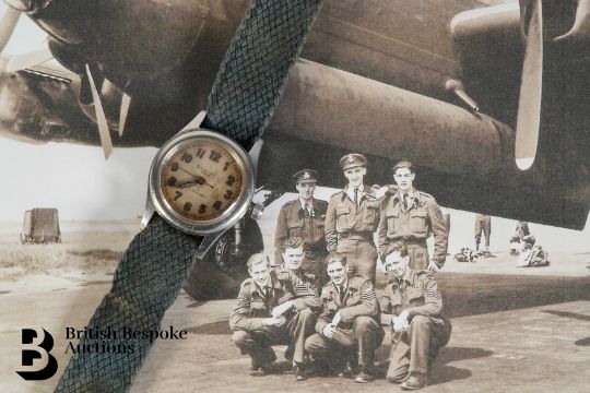 1942 Solar Aqua (Rolex) gentleman's wrist watch. The watch having a circular 28mm cream face with Arabic numerals on a grey plaited wrist band, nr 201592. The watch was owned by Flight Lieutenant Tim Fanning. He purchased the watch in Toronto in 1942, after completing the Commonwealth Air Training Programme which trained pilots for service in WWII. In 1944 he joined RAF Bomber Command where he completed multi-engine heavy bomber pilot training, after which he joined 195 Squadron operating Avro Lancaster's based at Wratting Common Cambridge, flying 26 bombing operations over Germany until the surrender in May 1945. He then flew a further eight operations 'Operation Manna' dropping food to the starving Dutch population and repatriating British POW's. Flight Lieutenant wore the watch throughout his wartime RAF career and for the remainder of his life. Two photocopies of the original photographs accompany this lot as well as several pages of the various operations over Germany.  Note: Please read a very Interesting article regarding 195 Squadron on the following link - https://www.wcnhistory.org.uk/sqn195.html