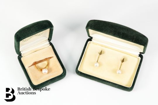 A Mikimoto 14ct yellow gold cultured pearl ring. The pearl measures 8mm, approx 4 gms together with a pair of Mikimoto white metal pearl ear studs, approx 7mm diameter, in the original presentation box.