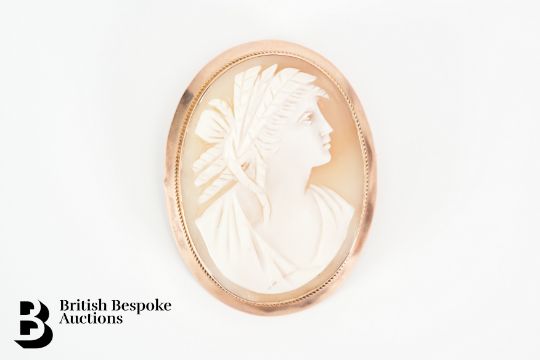 9ct rose gold shell cameo brooch, carved with a classical profile, approx 50 x 40mm, 12.2 gms.