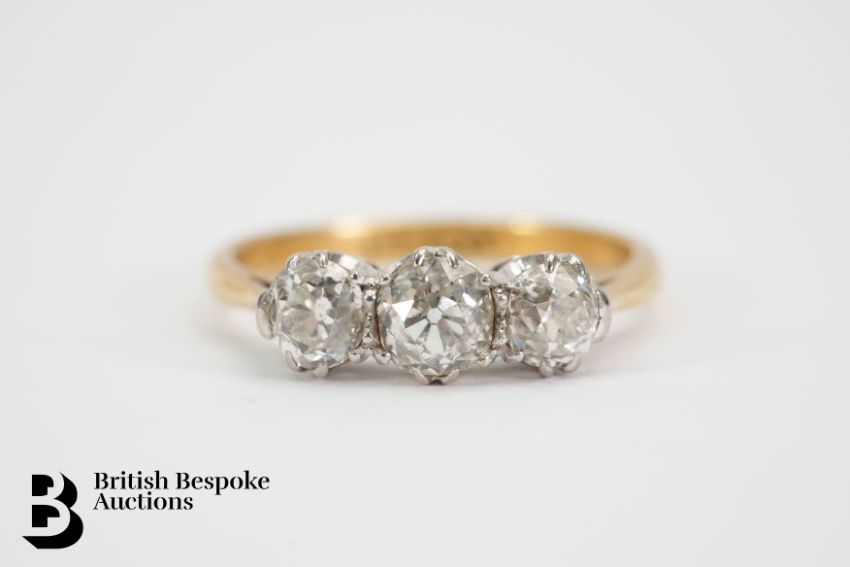 An antique 18ct gold and platinum three stone diamond ring, set with a 60pt old cut flanked by two 40 pts dias, size N, approx. 3.25gms.