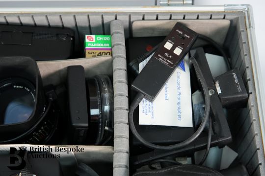 Boxed Rolleiflex 6006, nr 006580003 together with 120 film magazin, Rollei-HFT nr 8075945 Sonnar 1:4 f=150mm; Rollei-HFT nr 8071758 Distagon 1:4 f=50mm; Rollei-HFT nr 8093873 Planar 1:2.8 f=80mm together with a number of filters, accessories, brochure and manual.
