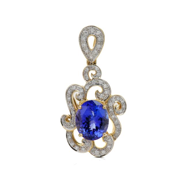 An 18ct yellow gold oval tanzanite and diamond pendant. The oval intense tanzanite measuring approx. 11.32 x 9.25 x 6.71mm, estimated at 5.2ct, set in a scroll mount with approx. 0.25 cts of diamonds, colour G/H, clarity VS. Pendant measures approx. 37 x 20mm, total weight 8.4gms.