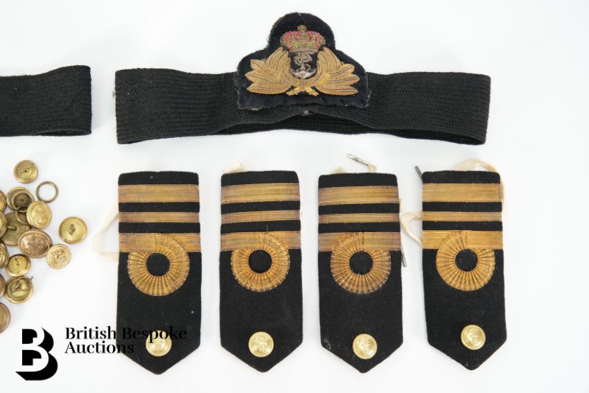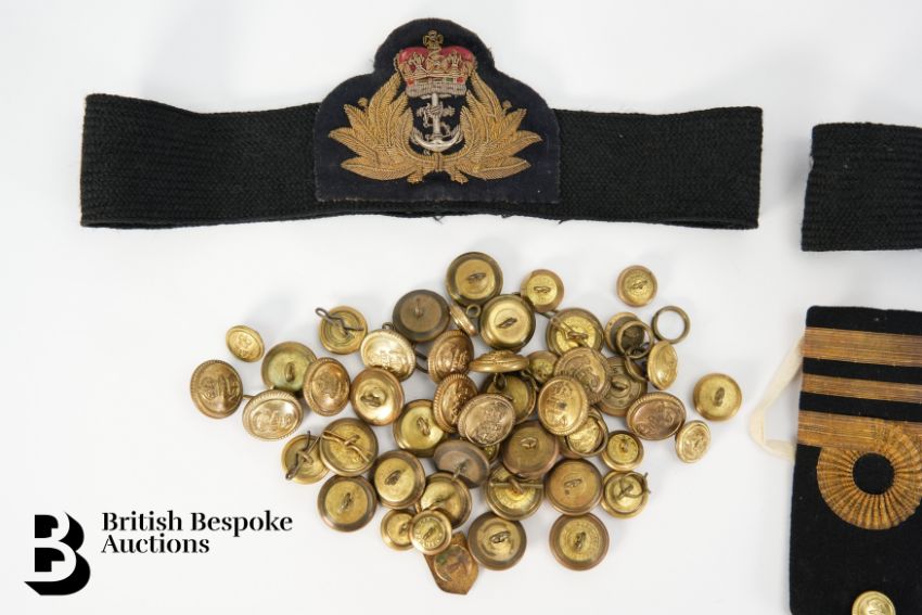 Embroidered Gieves Limited Royal Navy Lieutenant Officer's Issue Shoulder Boards together with two Royal Naval cap badge and bands; forty-seven brass buttons.