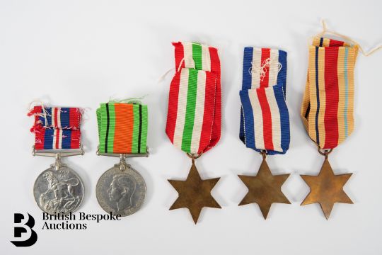WWII medal group, the box addressed to Mr C. Jones Bedminster, Bristol, each medal is unnamed, service medals are as follows: Africa Star, Italy Star, France and Germany Star, Defence Medal and War Medal.