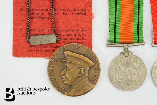 WWII campaign medals to 045348 Captain Kenneth George Alexander Bell, including The Burma Star, The 1939-45 Star, The Defence Medal and 1939-45 War Medal, together with a silver ID bracelet, Identity Card Army in India and an Indian States Umaid Singh bronze Victory medal, 1945: obv bust of the king in uniform as an Air Commodore, legend around H.H Maharaja of Jodhpur, rev: fortress of Mehrangarh fort and date V.E May 8 V.J Aug 15 1945, 74.39g, 50.46mm