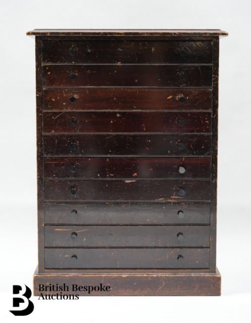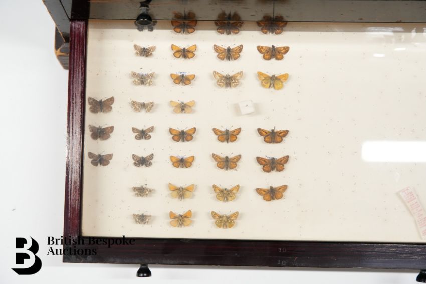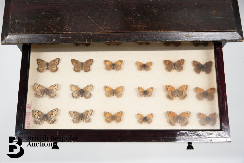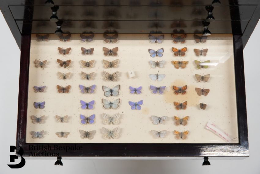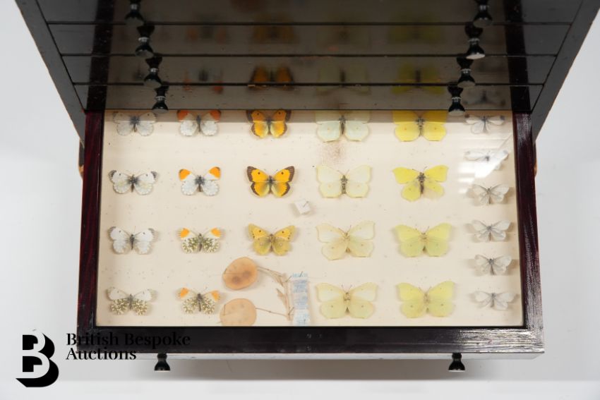A cabinet of butterflies and moths, approx 67 x 29 x 50 cms. This cabinet contains ten drawers. Drawer 1 - 24 butterflies (in good condition) Drawer 2 - 8 peacock butterflies including 4 showing the underside Drawer 3 - 11 butterflies to including 9 examples of the Marmon Fritillary (one disintegrated) and a fine example of an Edward Asian silk moth Drawer 4 - 24 English butterflies to include eight tortoiseshell upper and underside examples, 8 painted lady, one disintegrated and 8 Red Admiral showing upper and underside Drawer 5 - 24 butterflies including 8 marbled white, 8 wall butterflies and 8 speckled wood Drawer 6 - 18 butterflies including 8 Ringlet butterflies, 3 Duke of Burgundy and 7 small Heath butterflies Drawer 7 - 51 butterflies (some disintegrated) to include 7 small copper, 10 holly blue and 7 Brown Argus Drawer 8 - 21 butterflies including 6 Cabbage White, 5 green veined white and various others Drawer 9 - 25 butterflies to include 6 Eastern Wood white, 4 Common Brimstone upper and underside, 3 Lesser Coloured yellow, 4 Orange Tip, showing both the upper and underside Drawer 10 - 32 small butterflies, including 11 grizzled skipper, 8 Essex skipper, 7 Silver Spotted Skipper and 6 Large Skipper.
