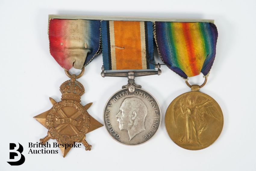 WWI medal group named to 2002 Pte. H. Dickenson Rifle Brigade, together with a 1914 Christmas box, bullet and a note from Rifleman Dickenson's Commanding Officer 'I wish to compliment you on your conduct on the night of 10/9/1916 raiding the German trenches' signed framed.