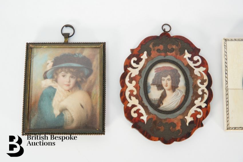 Four porcelain miniatures, including an early 20th century portrait miniature of a small girl wearing a blue hat and an ermine muff approx 70 x 80 mm unsigned; 18th century portrait miniature of a young woman, dated 1780, monogram R.A approx 53 x 66mm; an 18th century portrait miniature of a young woman, signed and titled Ms Lindby approx 38 x 50mm and another portrait miniature of an 18th century woman in an elaborate bonnet, titled Lady Austin, approx 40 x 44 mm.