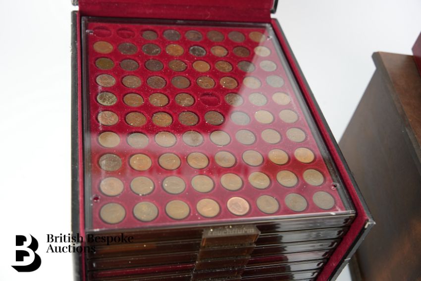 A ten drawer coin case containing miscellaneous 19th and mostly 20th century world coins, some silver, including farthings (1822-1956), three pence (1885-1963), 4x four pence (1842-1848), shillings (1816-1966), 1/2 crowns (1943-), Irish coins, Victorian and Georgian half penny coins incl. 1720, 1725, 1754, 1799, 1806, 1807, 1841, 1854, 1855, 1864, 1872, 1874, 1878, 1889, 1891 and 1895, quantity of 50ps incl. a Disney Winnie the Pooh S is for Smile 50p and some in plastic covers, United States of America 1 cent coins 1844, 1856, 1897 (damaged), many pennies and half pennies, quantity of silver coins including 1820 George III crown and 1822 George IIII crown. Together with a 6 drawer coin cabinet containing miscellaneous 19th and mostly 20th century and 21st century world coins, including franc, African franc, rupees, rupiah, krona, dollar, lira, Hong Kong dollars etc, several Canadian cent (1963-2009) plus colour Canadian 25c, 10c, $1 and $1, Jersey shillings and pennies, half crowns including (1887, 1917-1962), half crowns, amongst others. Would benefit from inspection.