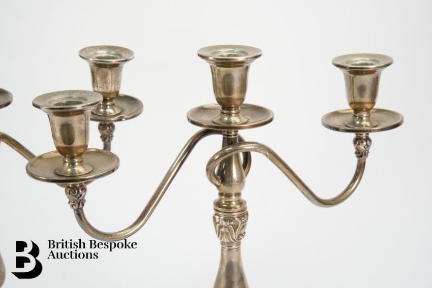 Pair of 20th century Royal Danish two branch candelabra, having scroll arms with three lights, waisted column on circular weighted foot, approx 34 cms h, 1225 gms each.