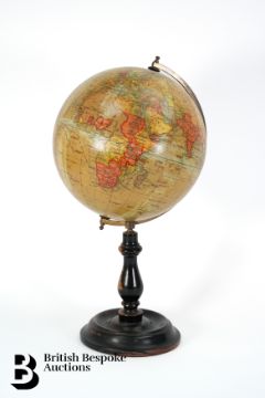 Late Victorian Geographia 8" Terrestrial globe, showing Railways, Steamer Route distances in Sea-miles, Heights in English Feet, British Possessions, mounted in brass half-meridian, supported on a turned ebonized stand, circa 1880-1890, approx 40 cms h.