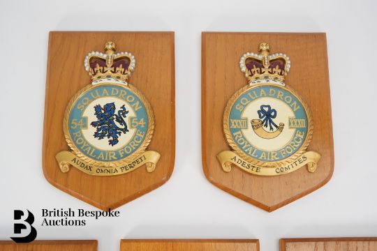 Five RAF Squadron wall plaques including Squadron 72, Squadron 54, Squadron 6, Squadron 247 and Squadron XXXII each mounted to an oak shield approx 24.5 x 17 cms.