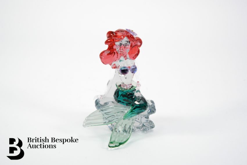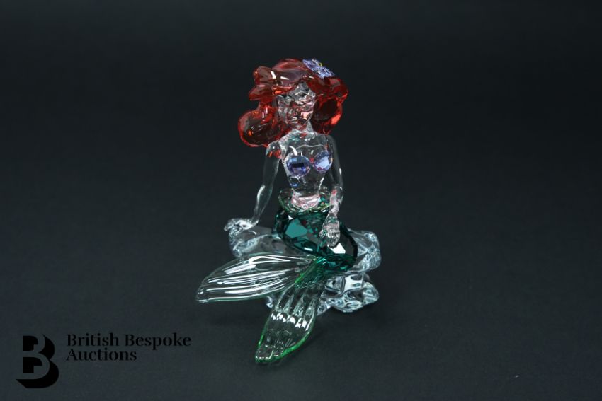 A 2021 Swarovski crystal Disney figure of Ariel from the The Little Mermaid. She is depicted seated on a clear crystal rocky outcrop, emerald green tail and red hair, approx 10 cms h, complete with the original box.