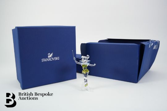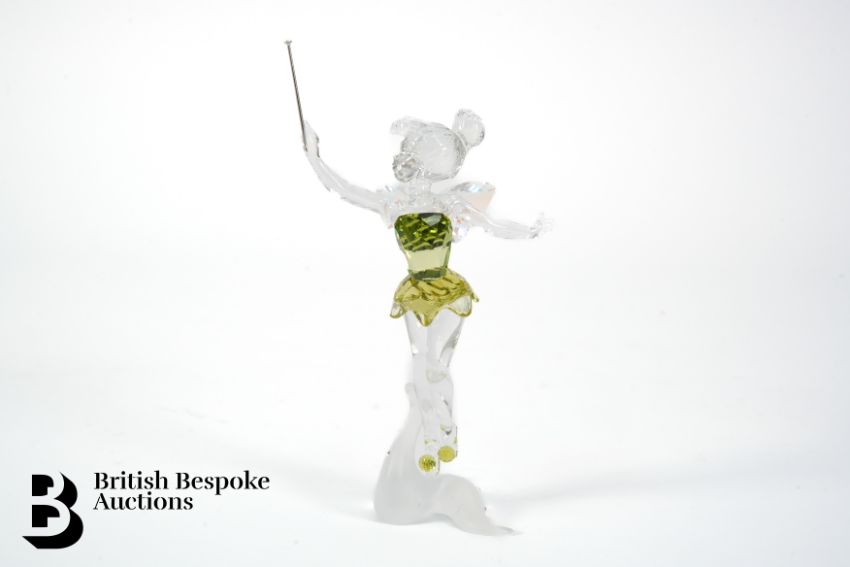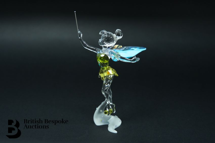 A Swarovski crystal Walt Disney figure of Tinkerbell. She is depicted casting a spell with her wand, green crystal tunic and pompoms, with azure blue wings, approx 11 cms h, complete the original box.