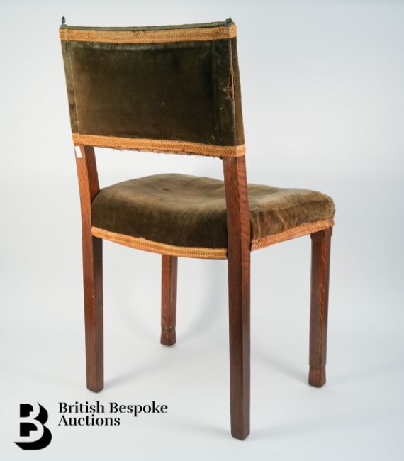 A pair of George VI oak coronation chairs by W. Hands & Sons, circa 1937, with velvet upholstery and embroidered with a crowned GR cypher, raised on chamfered square supports, approx 49 w x 40 d x 96 h cms.  (af) Condition Report The upholstery one of the chairs is loose and will need upholstery.