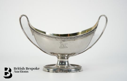 Pair of Georgian silver salt cellars in the neo-classical twin handled style, beaded decoration to borders, gilt interiors, supported on oval weighted bases, London hallmark dated 1785, mm SG, approx 435.5 gms.