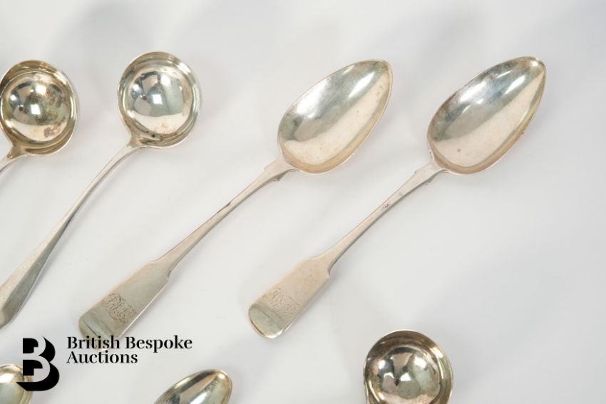 Two Georgian silver tablespoons, London hallmark dated 1776, mm BC, another London hallmark (rubbed), two Georgian silver tablespoons, both Exeter hallmarks dated 1814 and 1829, mm Joseph Hicks and William Woodman, together with a small silver spoon (marks rubbed). This lot concludes with two rat tail sauce ladles, Sheffield hallmark dated 1898/99 mm CB & S and another sauce ladle, London hallmark, dated 1809/10 mm RC, approx 342 gms.
