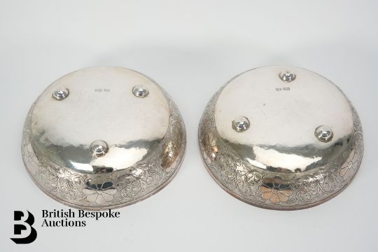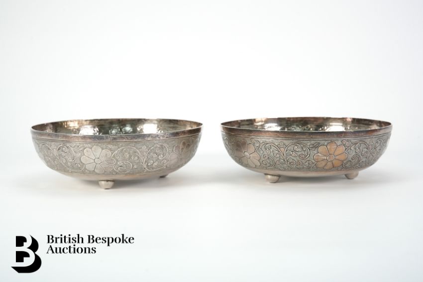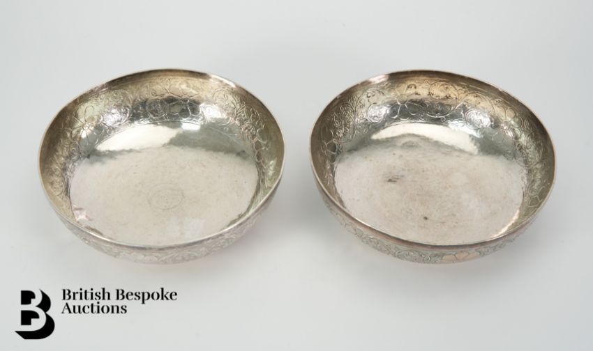 A pair of Malaysian silver rice bowls, with incised arabesque and flower decoration, approx 16 cms diameter x 5 cms h, stamped with character marks and an A.H makers mark, approx 450 gms.