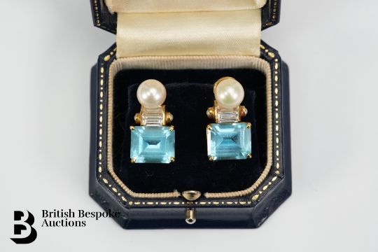 A pair of bespoke 18ct yellow gold blue topaz and pearl earrings. The earrings set with emerald-cut topaz 12 x 10 and two 8mm pearls, approx 23mm drop, 11.7 gms.