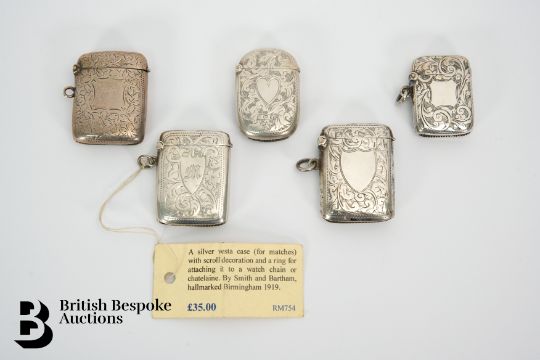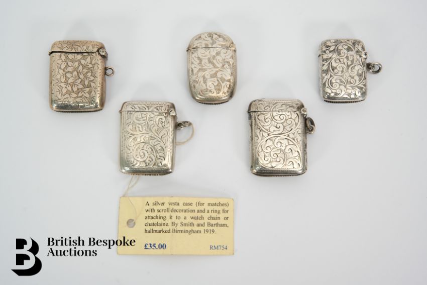 Five silver vesta case, the first Birmingham hallmark dated 1919 mm Smith and Bartham; next Birmingham hallmark dated 1902 mm T. Beardsmore; next Birmingham hallmark dated 1902 mm Joseph Gloster; next Birmingham hallmark dated 1915 mm Joseph Gloster and lastly a Birmingham hallmark vesta dated 1900 mm John Edward Wilmot, gross weight 109.3 gms.