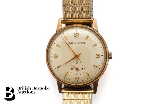 Gentleman's 9ct gold Smiths Astral wrist watch, having a champagne face with numeric and baton dial, and subsidiary seconds dial, case approx. 32mm, presented on elasticated strap. Movement number 604618, 15 jewel movement. Weight including movement approx. 35gms.  Condition Report Watch moving forward at time of testing. Face in good condition, corrosion to hands. Engraved to back 'British Railways F. Gill in appreciation of 45 years service'No guarantees given or implied on the movement of watches.
