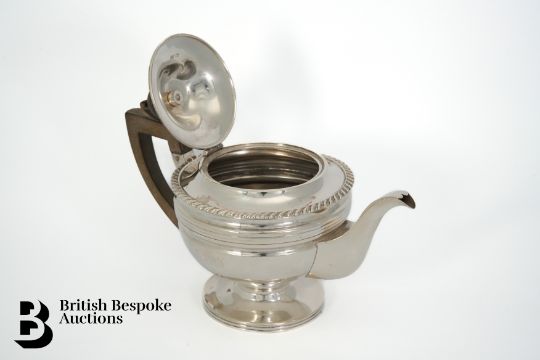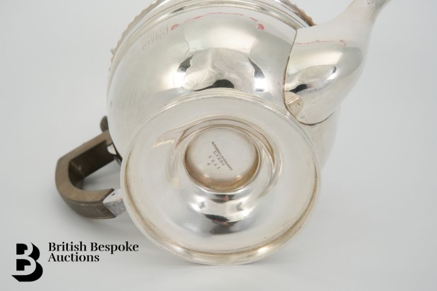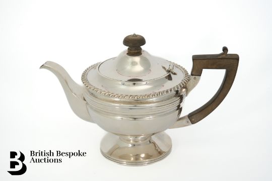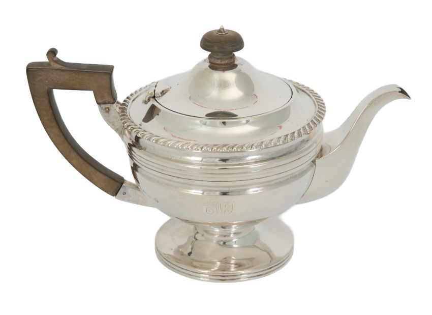 George V silver tea pot, Sheffield hallmark dated 1918, mm James Henry & Herbert Barraclough, approx 650 gms. The tea pot having a ribbed body and foot with fruit wood handle and finial, approx 195 x 26w cms.