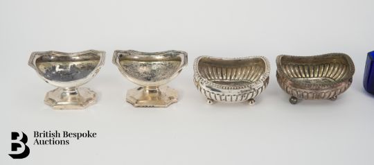 A pair of George III silver salts, London hallmark dated 1800, mm Thomas Wallis II (no inner liner), 150 gms together with another pair of George III silver salts, London hallmark dated 1818, mm Michael Starkey 150 gms (no inner liner). This lot concludes with three Bristol blue liners approx 7.5 x 5 cms.
