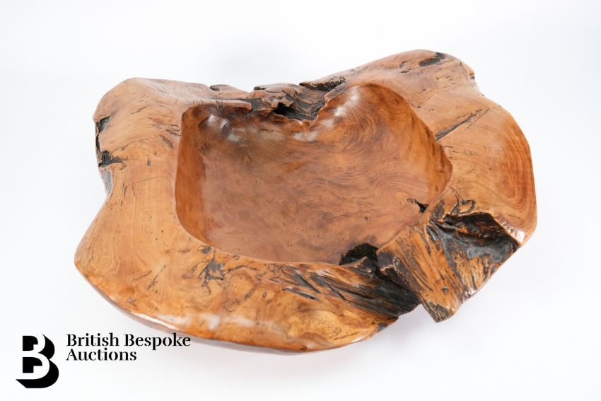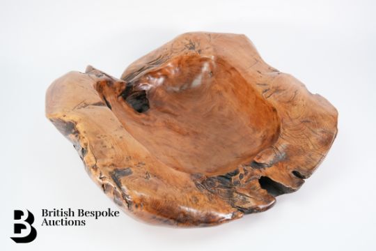 A polished burr walnut bowl, approx 48 x 48 cms.