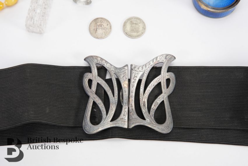 An early 20th century Continental belt buckle and elasticated belt together with a blue enamel pill box, a lilac enamel trinket box and two cut-glass scent bottles. (5)